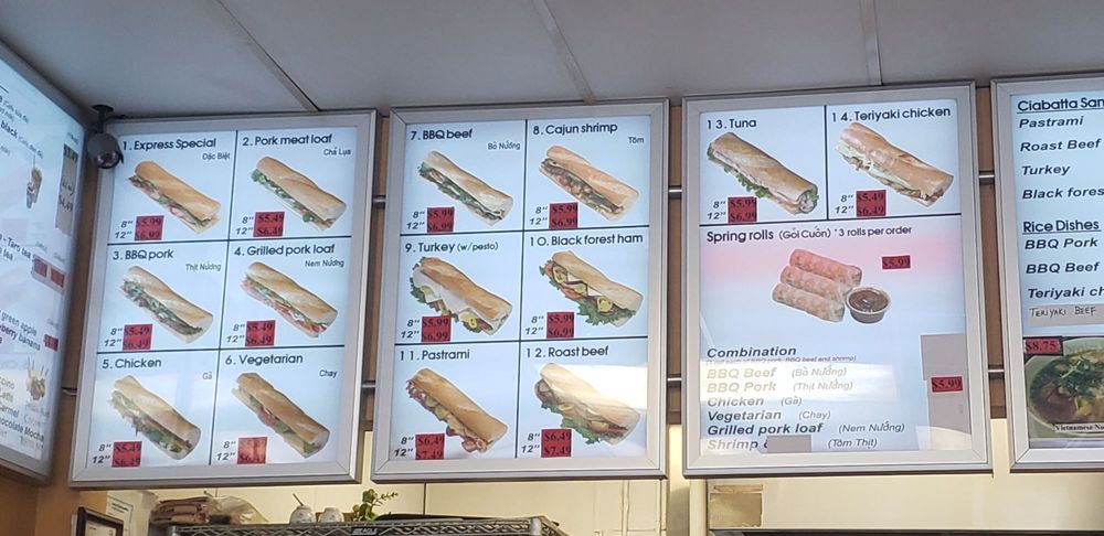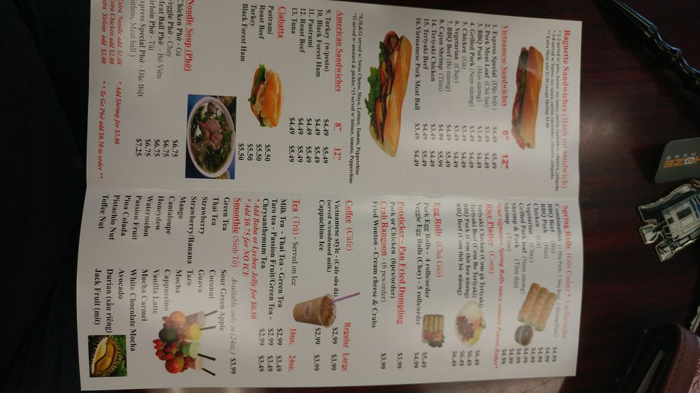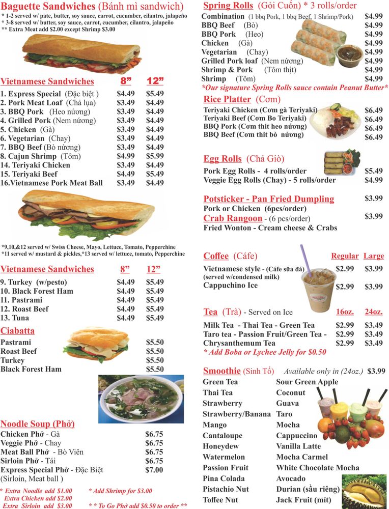 Tucked away in San Bernardino, Baguette Express offers a delightful taste of Vietnamese cuisine, specializing in sandwiches that showcase vibrant flavors and fresh ingredients. Their menu features an enticing selection of baguette sandwiches, such as the beloved Express Special and BBQ Pork, served with traditional toppings like pâté, butter, and fresh veggies for just $2.99 to $3.99. The ciabatta options, including Pastrami and Roast Beef, are equally enticing at $4.99.
